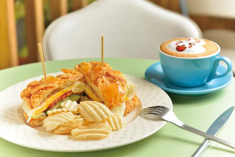 ▲丹麥歐姆培根堡160元(前)/採用丹麥波羅麵包增添口感。立體兔兔原味卡布120元(後)/超可愛的兔兔拉花讓人捨不得喝。附餐飲料可折價。