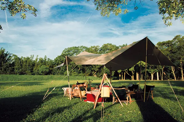 ▲大片草地、藍天一望無際,在自己親手搭設的遮陽篷下休憩、談天,舒適至極。