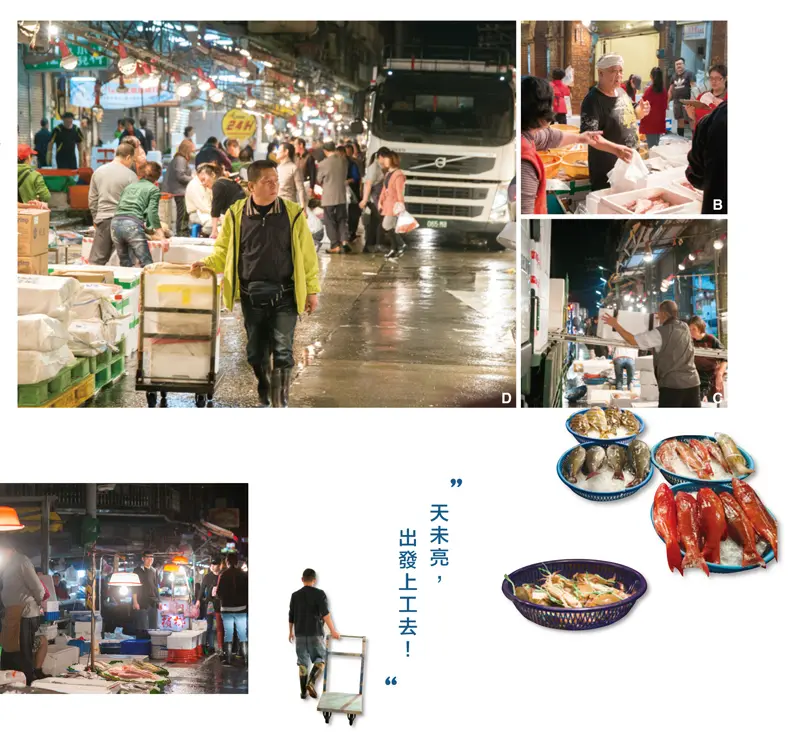 凌晨時分,當夜幕低垂,這裡才剛開始漸漸熱絡起來,一點開始就可以看見大貨車不停進出,將新鮮的魚貨卸下,路上兩旁都是魚販,只留下中間一條通道,剛剛好留出一台貨車的空間。接下來最生動的畫面莫過於糶手開始喊價,早期與日本相同,使用的是暗碼買賣的方式,以手指觸碰對方的手背,依敲打次數來議價;後期到現在則是使用來自英、法的口頭議價方式,也因此糶手就成為必要的存在。糶手被稱為魚市場的靈魂人物,早期要經過三年多的訓練才能出師,一開始喊價就像是場表演,還會搭配手勢與動作,生動至極,來這裡批貨的買家也都是老手,看著他們一來一往的出價、喊價到最後的成交,他們充滿特色的喊價技巧,每個過程都令人嘆為觀止。也讓崁仔頂漁市不僅是購買新鮮魚貨的市場,更充滿活力及生命力,讓許多人認識不一樣的基隆。
