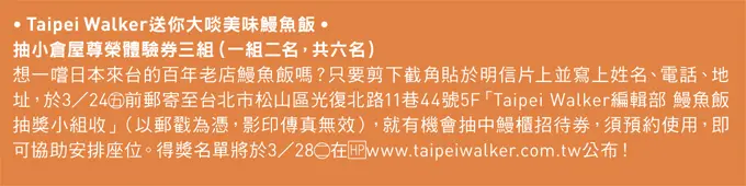 ●看《Taipei Walker3月號》剪下雜誌活動截角,送你大啖鰻魚飯