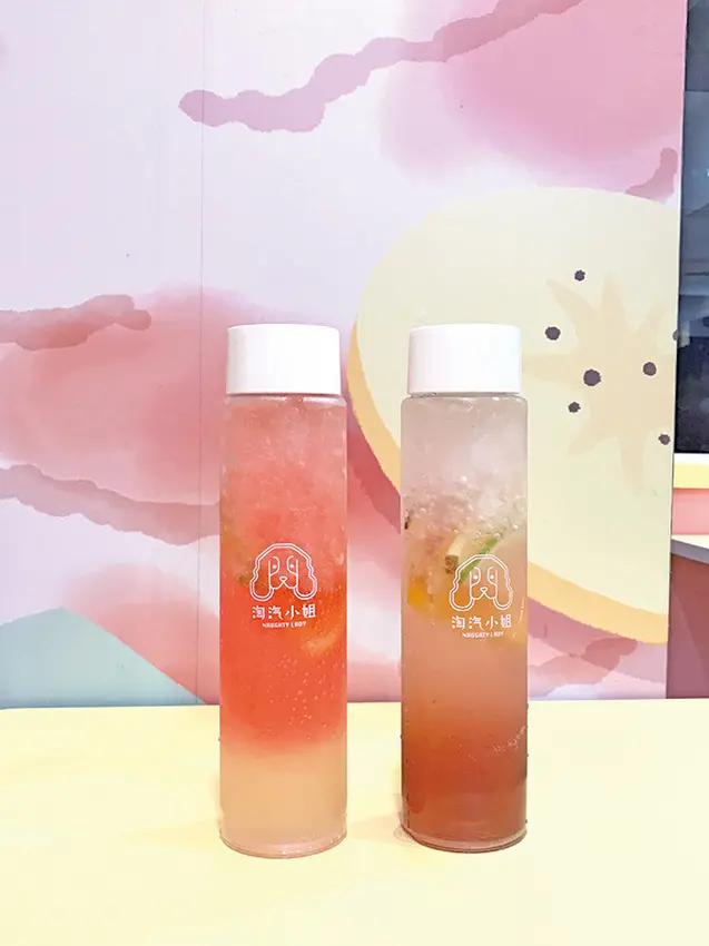 以馬卡龍色系打造門面的淘汽小姐洋溢著夢幻氛圍,店內除了淘汽系列,另推出淘汽沙瓦、淘汽微醺系列,「換你來淘汽」則可讓客人自選搭配氣泡飲。好淘汽是水蜜桃與覆盆莓的組合,而酸酸der則是蘋果加黑醋栗。