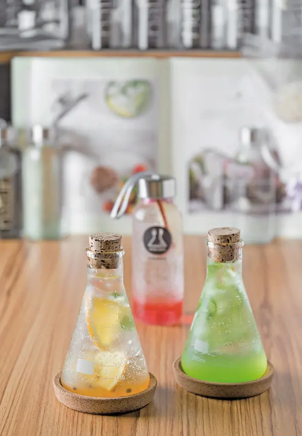 以九宮格餐點聞名的吾獨食驗室,使用Natura微礦氣泡水並以食驗三角錐瓶盛裝的氣泡飲也很吸睛,店內最受歡迎的氣泡飲是百香柳橙、綠巨人浩克,混合奇異果、小黃瓜與檸檬汁的綠巨人浩克,口味相當獨特。