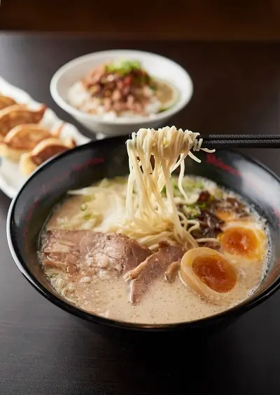 ▲招牌男味原味拉麵320元/是店內銷售第一的口味,豪氣的擺上五片叉燒與黃金味玉,湯頭越喝越順口,十分有飽足感,此外也可以點盤外皮酥脆鮮嫩的煎餃與台灣限定的通堂辣味噌飯,滿足什麼都想試試的味蕾。