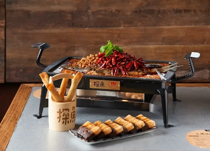 由六角國際集團引進的探魚是來自中國的連鎖餐飲品牌,2013年展店,目前在中國的連鎖店已有一百多家,由於裝潢時尚,又結合了藝術,散發著文青氣息,因此也被稱為是最文青的烤魚店,台灣首店選擇在台中落腳。走進店裡映入眼簾的是色彩繽紛的店裝巧思,設計師以復古、懷舊為發想,並加上工業風元素,使店內呈現新舊交融的風格。這裡的招牌料理正如店名以炭火烤魚為主,以多種料理技法發展出16種口味,道道令人驚豔。點餐方式先選魚種,有台灣鯛、凌波魚、草魚方、金目鱸魚四種,選好接著選擇想要的口味,像是麻辣、泰式酸辣、蒜香等,各種口味皆有愛好者,柔嫩的魚肉搭上煮到入味的調味,超下飯!