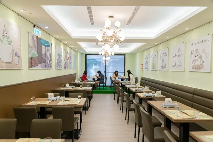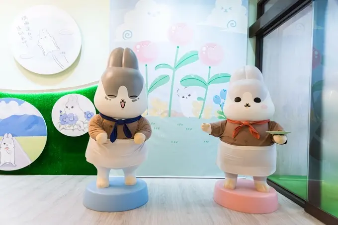 本身在做杯緣子的老闆,相當喜 歡ㄇㄚˊ幾兔貼圖,因緣際會製作ㄇㄚˊ幾兔杯緣子而認識插畫家,便決定合作開創貼圖主題餐廳,打造可愛、舒壓的用餐環境。走進店裡,大型立體造型公仔十分吸睛,穿過一樓主題商品販售區,沿著可愛牆面來到二樓用餐區,清爽明亮的空間相當舒適。為了打破一般人對於主題餐廳的印象,店家找來經驗豐富的義式料理主餐,研發美味餐點,更設計萌翻天的ㄇㄚˊ幾兔漂浮棉花糖、雞蛋糕跟馬卡龍,十足療癒人心。