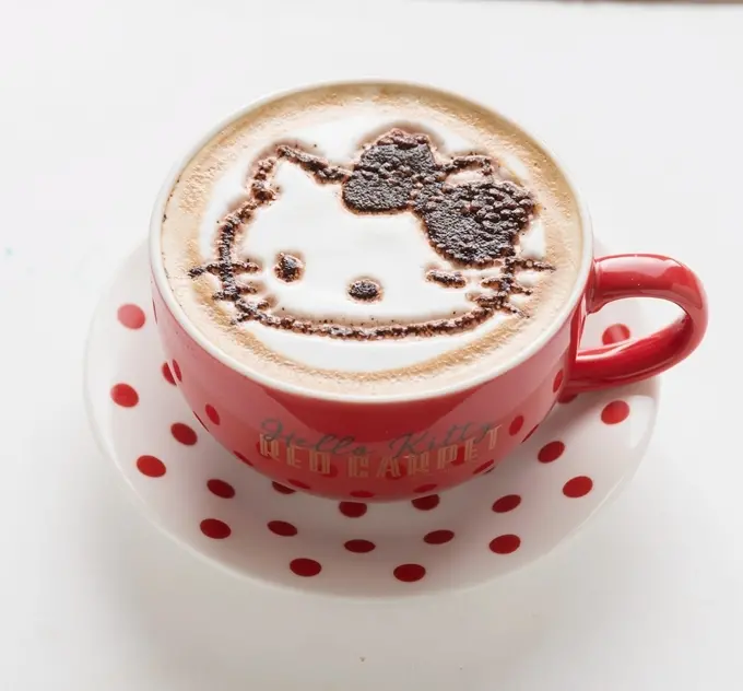 ▲拿鐵咖啡180元/以特別訂製的點點風餐具盛裝,時尚度破表;於表面灑上Hello Kitty可愛拉花,超萌模樣讓人捨不得喝下肚。