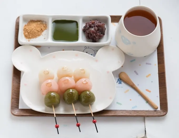 ▲三色花見糰子(配焙茶)180元/有原味、抹茶、櫻花口味糰子,以黃豆粉、抹茶、蜜紅豆作沾取搭配,另附一杯茶。