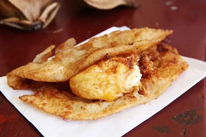開店時間一到,隨即可見長長的人龍出現,以黃色發財車炸出美味的「原路口炸蛋蔥油餅」,小小攤車占地不大卻總是吸引人潮聚集,原來美味的秘密就藏在蔥油餅內餡當中。將桿好的麵皮下鍋油炸,炸到金黃酥脆後起鍋,包在蔥油餅內的是滑嫩的半熟雞蛋,再沾上特製辣椒醬,咬下每一口都能吃到兩種口感,雙重享受。