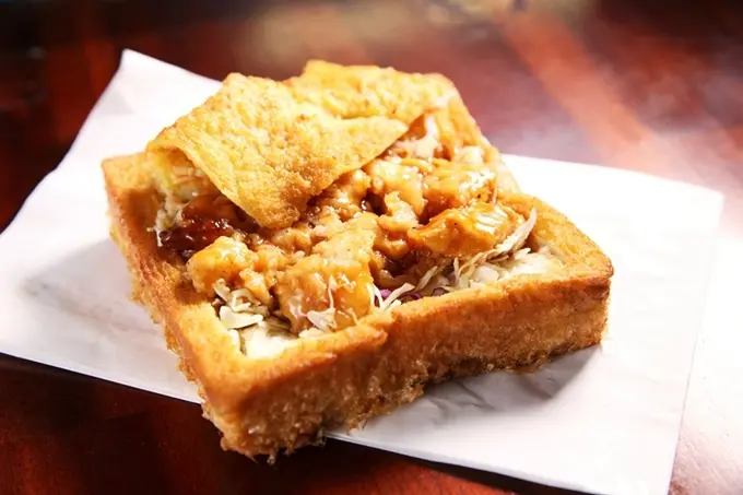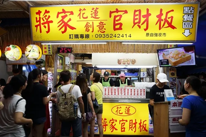 蔣家花蓮創意官財板將包裹著蛋液的厚片吐司下鍋炸到金黃,起鍋後剪開吐司放入各式食材,其中依季節食材推出的限定口味,讓遊客們大飽口福。