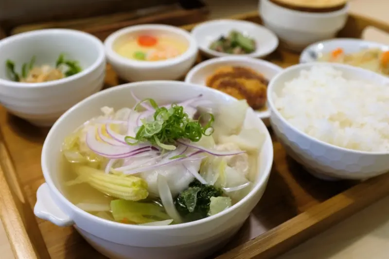▲養生山藥雞肉丸鍋物定食五菜一汁240元/清甜的湯頭、紮實的手工雞肉丸搭配磨成泥的山藥與各式蔬菜,溫暖又清爽的滋味,讓心情也豁然開朗。