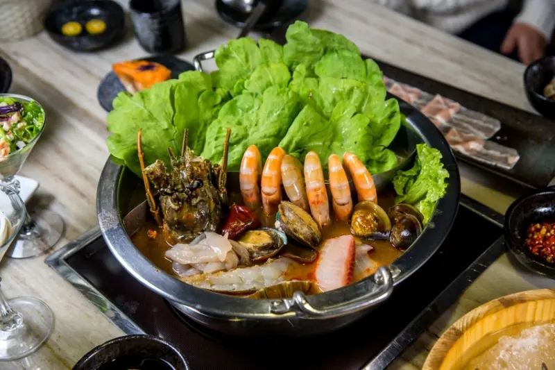 我認為這間是目前在高雄人氣最夯的平價火鍋店,特色在於有龍骨、麻辣、壽喜、素湯等四大湯頭,想吃兩種口味也可以做成鴛鴦鍋!推薦「小龍蝦總匯鍋」,兩尾龍蝦入鍋後差點把鍋子擠爆,再投入幾顆蛤蜊熬湯正好,豚骨湯加上海鮮下去現煮,清甜的湯頭直喝好幾口就不會油膩,光湯頭和綜合火鍋料的份量就嚇到我!還提供無限白飯、飲料吃到飽,整個超值。