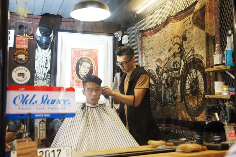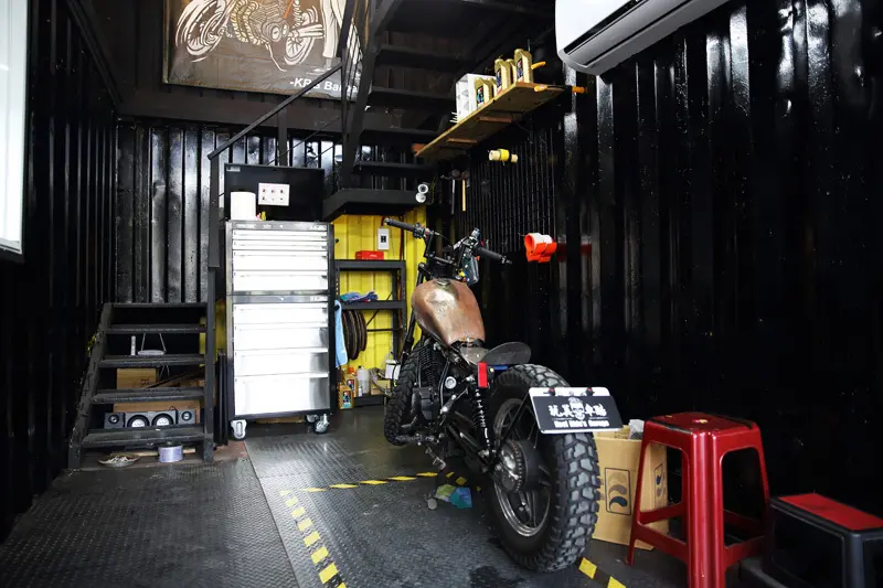 約一年前他進駐青創聚落,把車庫工作室搬過來,現在1樓專做摩托車改裝,2樓為理髮廳,輪胎、油桶、排氣管等零件,成了店裡最佳裝飾,重工業風格和貨櫃屋氛圍很搭。店裡的油頭有飛機頭等多款經典造型,同時提供男士修容。