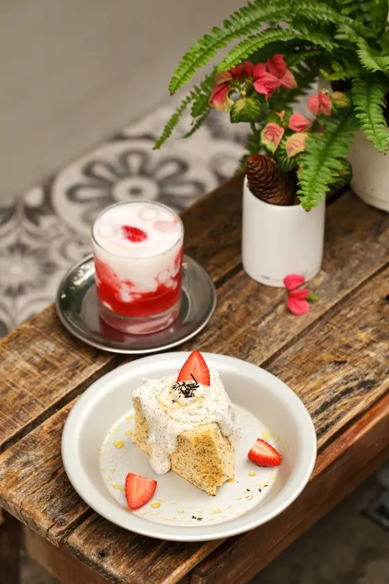 ▲蜂蜜伯爵戚風(前)160元/濃郁的伯爵茶香覆蓋著蛋糕,再淋上台灣純蜂蜜,自然的口感甜度也不算高。草莓牛奶(後)120元/限量/保有剛摘下的新鮮草莓滋味,酸甜滋味自然無負擔,屬於女孩系視覺取向。