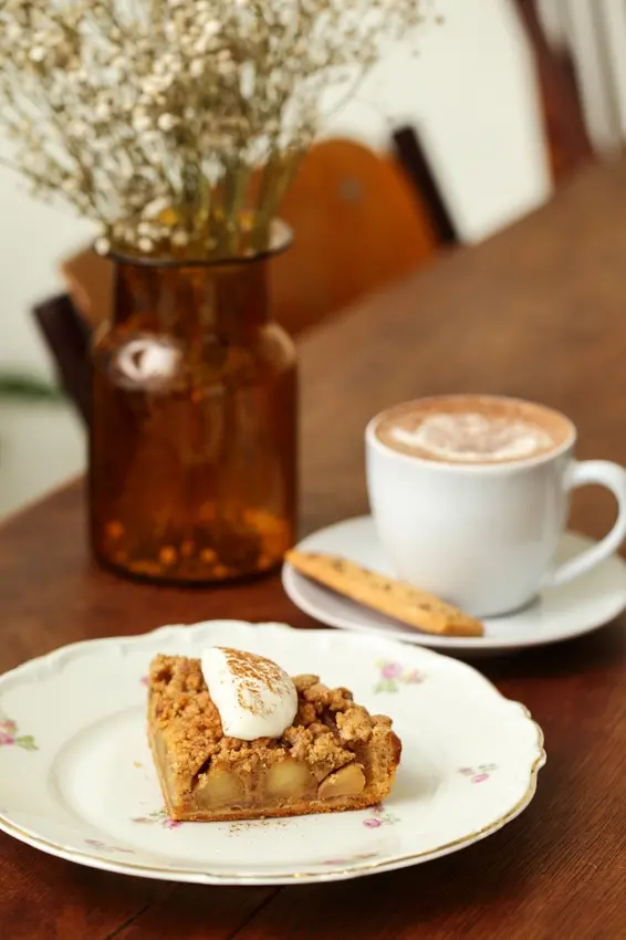 ▲鄉村蘋果塔130元(前)/使用自己打的帶皮杏仁粉做成的杏仁奶油餡和奶油,與焦糖炒過的蘋果香氣十足,呈現出有別一般蘋果塔的層次感。熱巧克力160元(後)/附餅乾/使用Weiss單一產區64%黑巧克力。