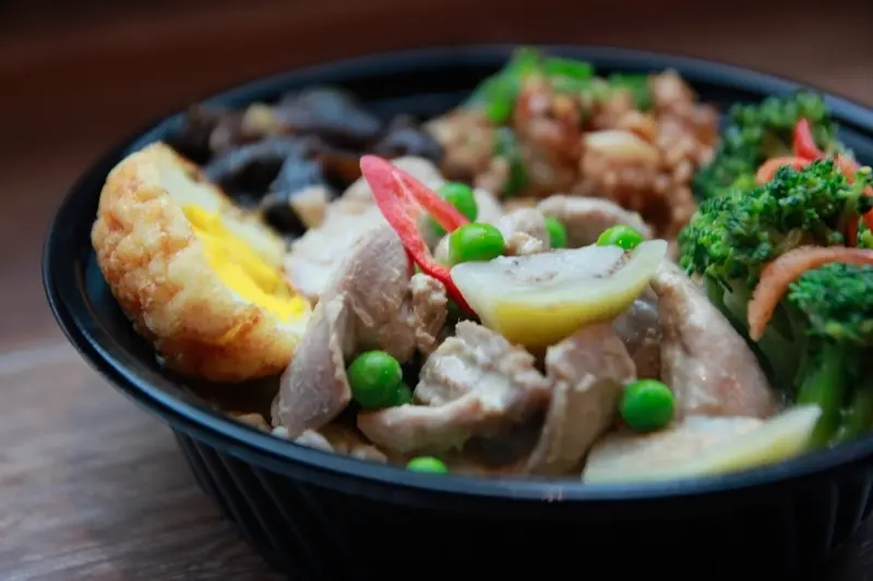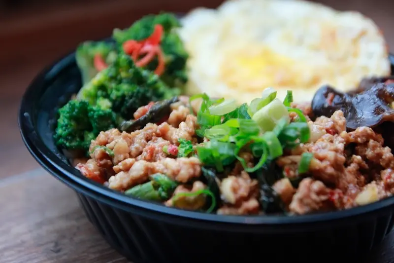 每款便當都會搭配的打拋豬肉末,更是廚師做菜火候的精隨呈現,附贈的女婿炸蛋搭配「是拉差辣醬」,也是泰式小吃的好滋味。