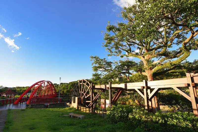 源自大屯山系竹子山脈的八連溪,以清澈溪流與豐富生態著稱,支流周邊共有5座以水車為主題的休閒公園,其中佔地近0.6公頃的福德水車生態園區,為三芝水車文化景觀中最大的園區,此地設有以高架引水道空中給水的大型木造引導式水車。建議可通過長42公尺的紅色景觀橋,再沿著環園步道,一睹當地生態,而一旁稻田隨風搖曳著,也增添多元樣貌。在水車對岸後方,設有有機生態村與共榮社區,可預約體驗農里生活的樂趣,若剛好巧遇茭白筍、山藥、甘薯盛產季節,亦可購回品嚐。