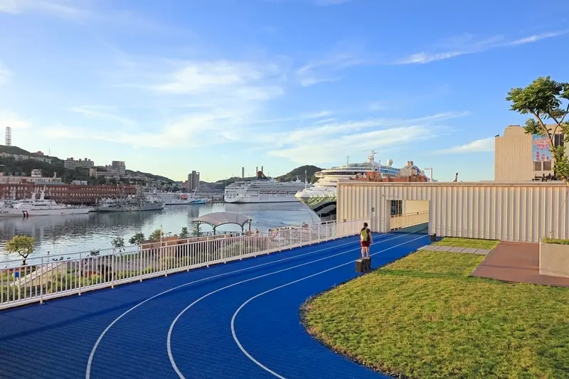 想要拍下基隆KEELUNG地標,不必再跑到遠處山頭取景了!全新開幕的基隆東岸複合式商場E-SQUARE,將原本老舊建築轉型為多功能複合式商場,其中頂樓所設置的空中跑道,能近距離一睹KEELUNG地標,以及港灣、郵輪風光。這裡特地將跑道漆上搭配海洋的藍色系,完美地與一旁港灣融為一體,尤其於夜晚前來氣氛更佳,堪稱全台最浪漫的跑道。