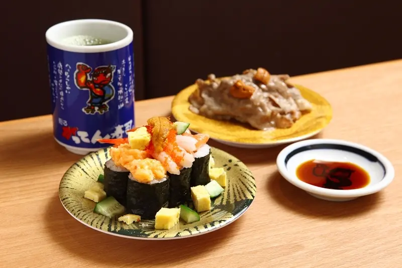 ▲海寶卷188元(前)/融入甜蝦、海膽、玉子燒、鮭魚、蝦卵,打造出繽紛的色澤視覺,口感亦擁有豐富層次。炙燒牛肉海膽128元(後)/台灣獨家新品,當海膽遇上牛肉,滋味意外的合拍。