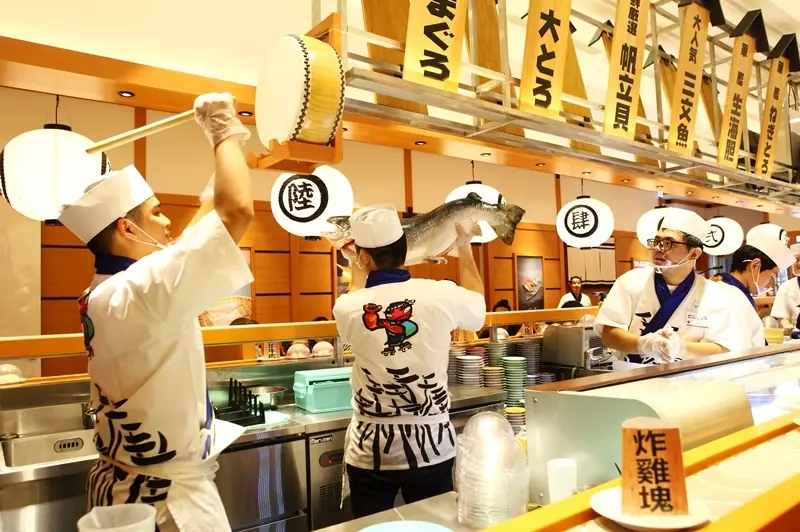 店內座位沿迴轉檯與工作區而設,可清楚看見親手製作的過程,不同於嚴謹的職人氛圍,每一位師傅,每隔一段時間便會拿起鼓棒、敲鼓公告著「最新鮮的漁獲在這裡」,隨後便會現場處理當日漁獲,製成最新鮮的握壽司,直接向周邊來客推薦,在專注的工作中帶有一股互動的熱鬧溫度。