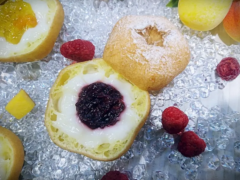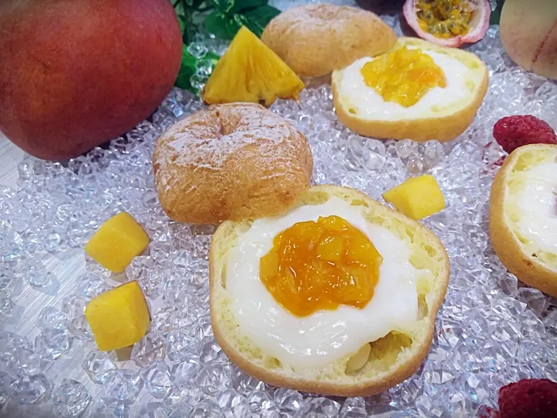 內餡則選用具夏天特色的熱帶水果、芒果以及酸度較高的覆盆子口味,搭配清爽的優格卡士達,整體內餡重量高達40%以上,每一口都能品嚐到新鮮果粒的微酸與香甜。