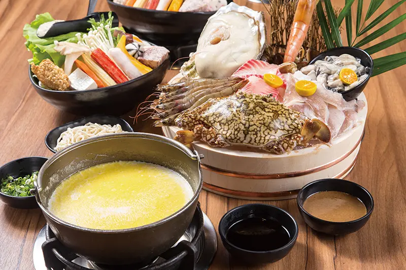 ▲NO.1巨無霸超猛海鮮620元/海鮮拼盤有來自南方澳的鮮蝦、蛤蠣、透抽、鯛魚、大螃蟹和東石鮮蚵、阿根廷天使紅蝦、美國大生蠔,氣勢十足!牛奶湯底需另加50元。