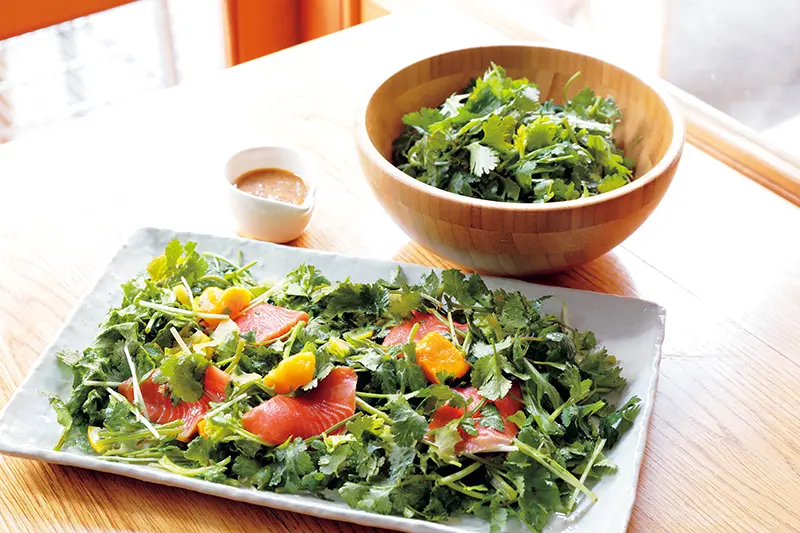 ▲パクチーのカルパッチョ(香菜涼拌醋醃魚)¥1058、パクチーと春菊のサラダ(香菜與春菊的沙拉)¥810/皆是必點的推薦菜餚。