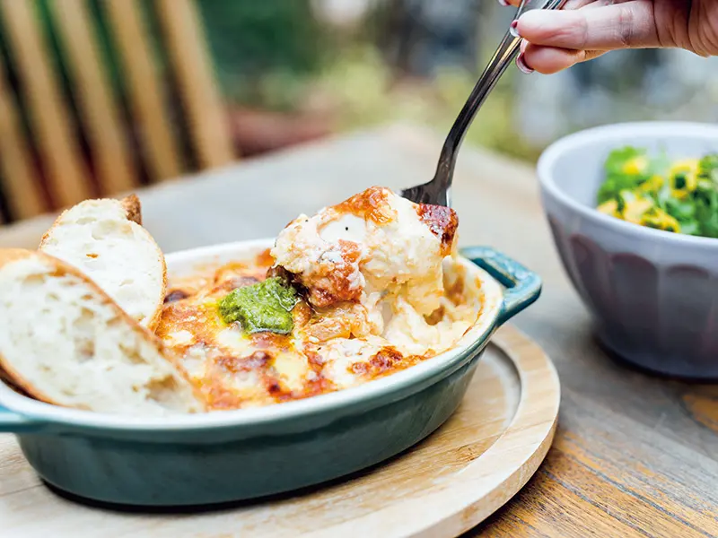 ▲豆腐ラザニア(サラダ付き)(豆腐千層麵附沙拉)¥1190/以豆皮、豆腐渣等烹調,將大豆料理發揮的淋漓盡致。另外採預約制的晚餐則能享用火鍋跟豆奶鍋套餐¥5500。