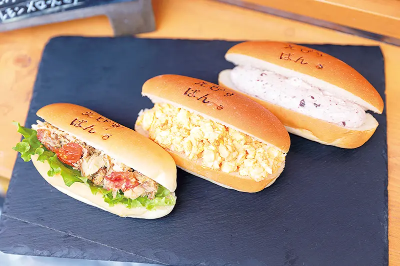 ▲麵包烙印著店名「えびすぱん」字樣, 約12種固定菜單加上期間限定的季節菜 單讓人每天都想光顧。燻製さば (燻製鯖魚)¥310/每早在店裡燻製而成。たまごぱ ん(蛋餐包)¥200/人氣口味。あんこ&マスカルポーネ(紅豆&馬斯卡朋起司) ¥270/紅豆內餡6小時悶炊而成。