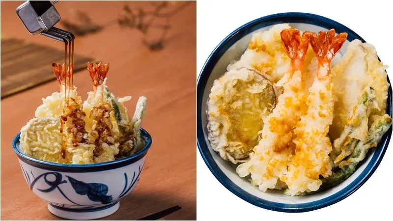 ▲特選海鮮天丼350元(右)/採用高成本、平均長度為35~40公分的穴子(星鰻),搭配櫻花蝦天婦羅,高CP值相當值得一嚐。