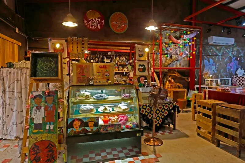 隱身夜市巷弄中,原以網購工作室為主的金派甜點,在空白服飾老闆的推薦下,一同入駐這處低調的秘密基地。通過空白服飾沿著階梯而上,隨即入眼的是嬉皮中帶有獨特美感的繽紛畫面,每一處擺設、裝飾、化妝室裡的泡泡球浴缸,還有桌上那本超大的木製Menu,皆宛如一股神奇力量帶你走入夢遊仙境般地不真實。而打造這一切的人,正是在工作區中擺設著甜點的女孩,融入自有藝術天份與自製甜點的熱情,勾勒出令人驚嘆的氛圍。
