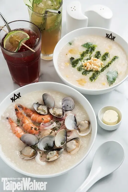 ▲檸檬奶油海鮮粥180元(前)/店內招牌海鮮粥,建議先品嚐原味,再搭配以檸檬、奶油與巴西里製成的奶凍,濃濃海味讓人彷彿來到西西里岸邊。塔香金沙雞肉粥100元(後)/放入青醬、鹹蛋黃,再以少許紹興酒提味,香氣十足。青梅洛神冰茶80元、冬瓜mojito(無酒精)80元(左後)/以新風貌呈現的古早味飲品。