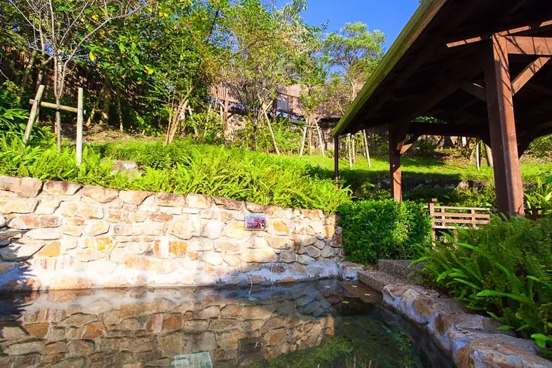 保留自然生態環境及日本和風設計風格,規劃溫泉游泳池、收費湯屋森林風呂、礁溪劇場等設施,礁溪溫泉屬弱鹼性的碳酸氫鈉泉,水溫約攝氏50度,色清無味,能輕鬆在綠意盎然環境下,感受露天泡腳樂趣,享受愜意時光!結束泡湯後,不妨漫步木造迴廊,欣賞鄉野間特有的樸實閒趣。