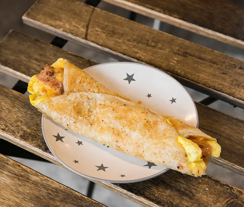 ▲起司肉排脆皮蛋餅 65元/煎至酥脆的餅皮極具口感,搭配豆腐乳招牌醬,超美味!