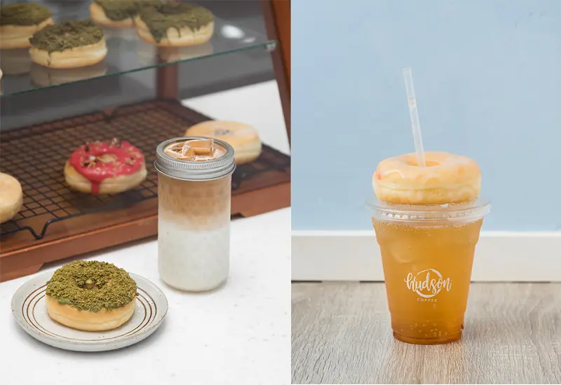 ▲抹茶甜甜圈 45元(左前)/先抹上抹茶白巧克力、再灑上抹茶奶酥,兼具茶香與酥脆口感,是店內人氣品項。拿鐵 80元(左後)/以造型玻璃瓶盛裝,漸層色澤賞心悅目。檸檬甜甜圈 40元(右上)/淋上檸檬糖霜,創造出微酸氣息。檸檬冬瓜汽水 80元(右下)/以冬瓜茶磚、檸檬汁與氣泡水調製而成,酸甜好喝。
