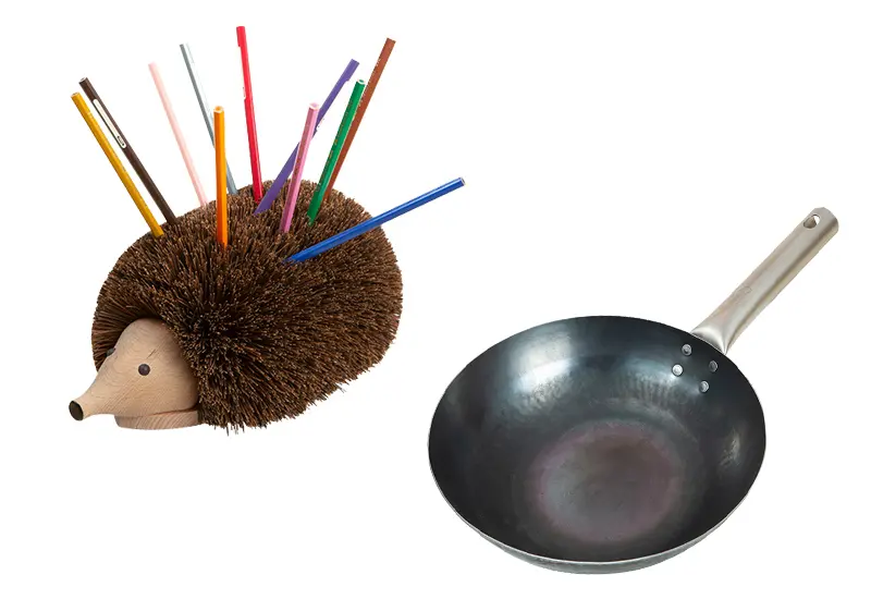 ▲刺蝟造型鞋刷 2700元(左)/德國Redecker產品,除了可作為鞋刷,也可當作置物檯,造型奇趣可愛。山田工業所Hanako拓打中華鐵鍋(厚1.2mm、直徑24cm) 4150元(右)/日本職人半手工打造的鐵鍋,適合中華料理使用。