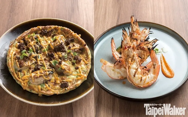▲西式蚵仔蛋煎580元(左)/於厚實蚵仔蛋煎上擺放6顆先冰鎮過的香煎廣島生蠔,再搭配美乃滋、豆豉,表皮酥香、口感滑嫩,與鮮甜十足的生蠔交織出傳統小吃的新吃法。YAKI澳洲虎蝦700元(右)/使用澳洲虎蝦,帶殼烤出迷人炙燒香氣,搭配西班牙紅椒番茄醬、烤酪梨,口感滿分!