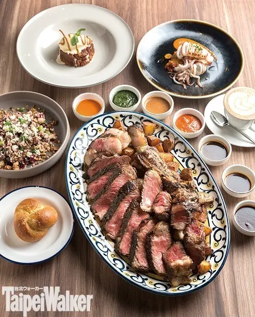 ▲美國頂級乾式帶骨肋眼牛排(4人份)880元+500元/人/店家於12:00∼15:00以880元起的優惠價格提供午間套餐,除了美國薄切紐約克牛排、南方澳鮪魚排、台灣究好豬排等主餐選擇,4人同行每人只要再加500元,就能共享份量約42oz的乾式帶骨肋眼牛排,每人另附開胃菜、甜點與飲品;開胃菜包含超級穀物沙拉(左)、YAKI東北角近海花枝(右後)等6種選擇,甜點則有蘋果塔(左後)等3種選擇。牛排佐料除了法國鹽之花,另推出泡菜辣醬、日式燒肉醬、阿根廷香草醬、中東紅辣醬、茴香辣醬、黑胡椒醬與BBQ醬等7款醬汁,可依人數選擇同等數量的醬汁作佐餐搭配。