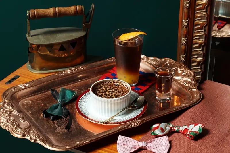 ▲豹蕾120元(前)/顛覆一般炙烤較久的鏡面烤布蕾,撒上黑糖不規則烤焦後,呈現出華麗的豹紋。特調咖啡200元(後)/視當天食材佐入水果、糖、萊姆汁,加上冰釀或濃縮咖啡,每一次都能品嚐不同風味,最後會附上1杯如SHOT大小、擁有提拉米蘇香氣的獨家咖啡,營造HAPPY ENDING的驚喜感。