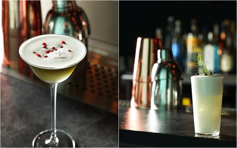 ▲松(左)/S/創作概念來自Pizza,於泡過珍珠草的黑色伏特加,加入甜椒、香吉士衝擊出視覺美感,口感溫柔適合女性。雪(右)/S/以台東刺蔥酒、鮮奶油,最後撒上原住民香料馬告,打造出宛如養樂多奶昔的獨家調酒。
