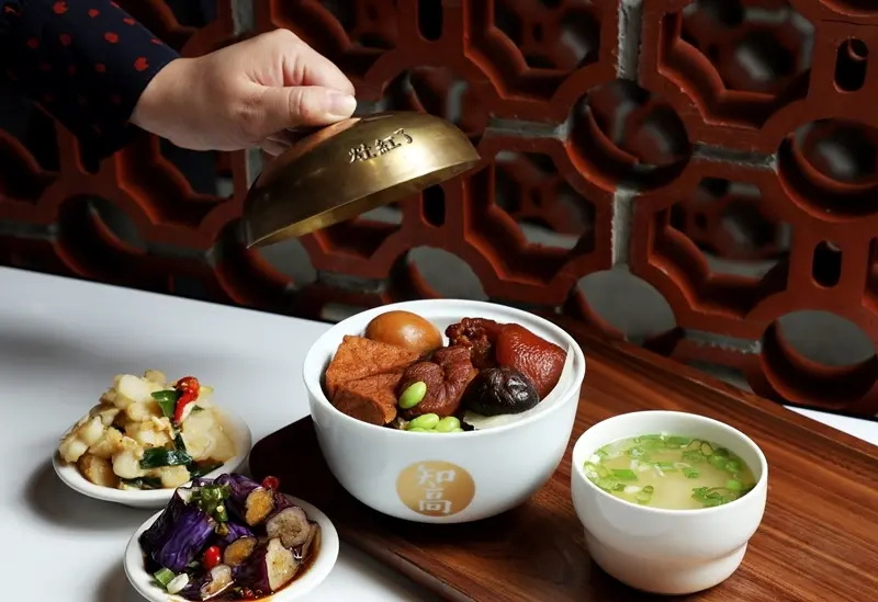 林致兵首次品嚐三重老店的知高飯就上癮,與創始人莊玉華一拍即合,在獲取莊玉華的信任與授權後,帶著這股老滋味走出三重,選在永康商圈展開一場「世代交替」的味蕾延續,採用黃銅的空間與餐具,展現出新生時尚感,當知高飯上桌、打開黃銅蓋的那一刻,更能感受不變的初衷。