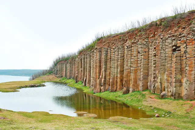 澎湖除了美麗的海島風情外,還有個極具國際知名度的景點,就是上千萬年前火山熔岩爆發後,遇到海水快速冷卻收縮凝固成六角狀的垂直柱狀節理玄武岩了,這是在澎湖很常見的地形。大菓葉柱狀玄武岩高八公尺、長一百公尺,粗獷又壯觀,下方還有一處略低的草地,積水時還可以看到柱狀玄武岩倒映在水池中,別有一番風情。