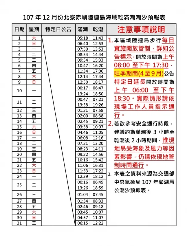 旺季期間 (4 至 9月) 特定日延長開放時間 06:00~18:30