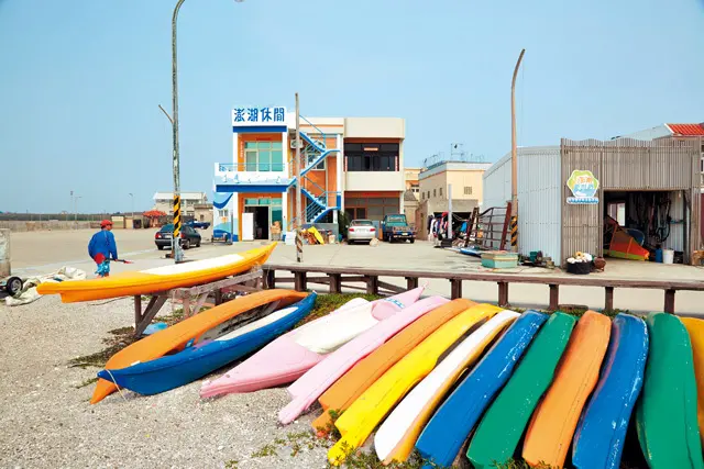 ▲位於海岸邊澎湖水上休閒是棟很可愛的小房子,外頭就放著繽紛的七彩獨木舟。