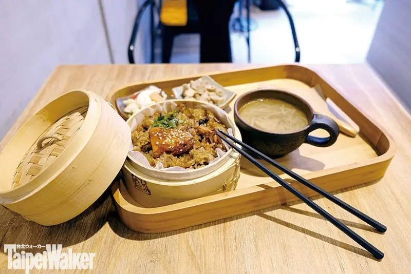 ▲古早味油飯套餐168元/放入櫻花蝦、魷魚、香菇的油飯,搭配蒲燒鯛魚片,瀰漫古早味的迷人香氣,另隨餐附2道自製小菜、每日例湯。