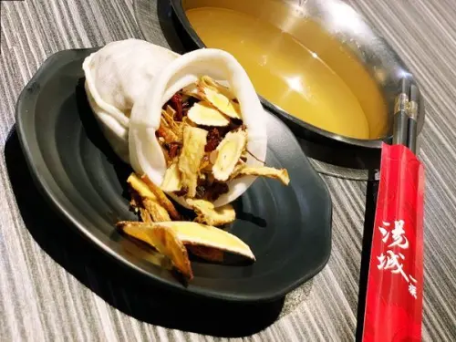 以「杏春德記中藥房」的中藥材為湯底,德記中藥火鍋在遵循食補的概念之下,推出多款養身藥膳鍋,包含藥膳排骨湯、十全燒酒雞與藥膳麻油雞等,每一種湯底皆以10多種中藥材慢火熬煮而成,湯頭甘甜醇厚。![]()