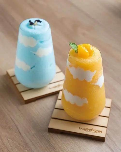 ▲雲の優格 芒果180元(右)/以希臘優格搭配酸甜芒果,爽口好喝。雲の優格 原味180元(左)/使用蝶豆花呈現夢幻藍色系外觀。