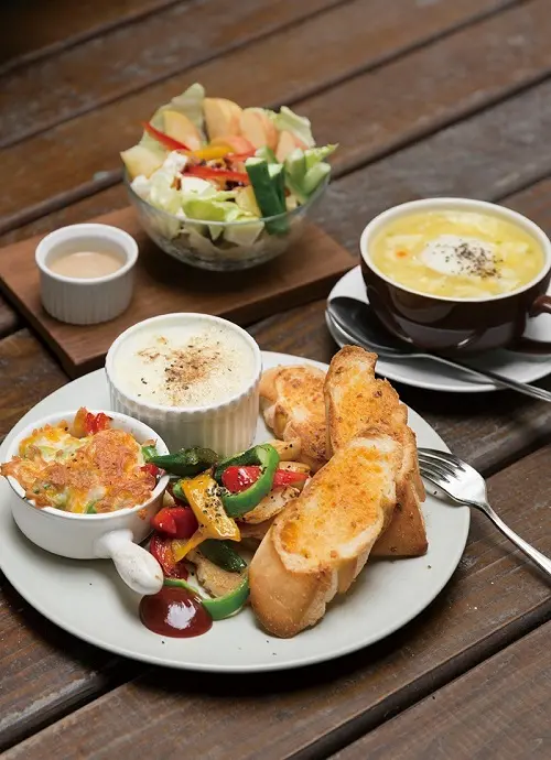 ▲蔬食早午餐240元/份量十足的健康早午餐,包含玉米濃湯、蔬果沙拉、鮮奶蒸氣蛋、香煎時蔬&馬鈴薯、起司焗烤時蔬與香蒜麵包。咖椰吐司70元/馬來西亞道地風味。