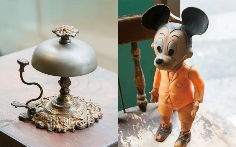 ▲服務鈴8000元(左)/藝術美感造型設計,流露著法國浪漫情懷。1950年代義大利米老鼠15000元(右)/少見的西裝造型米老鼠,以軟膠空心材質製成,極具收藏價值。