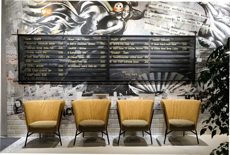 ▲店內供應7類風味精釀啤酒,特製看板更加強調以「酒」為主角的特色;牆面融入後現代街頭塗鴉藝術,極具時尚氣息。