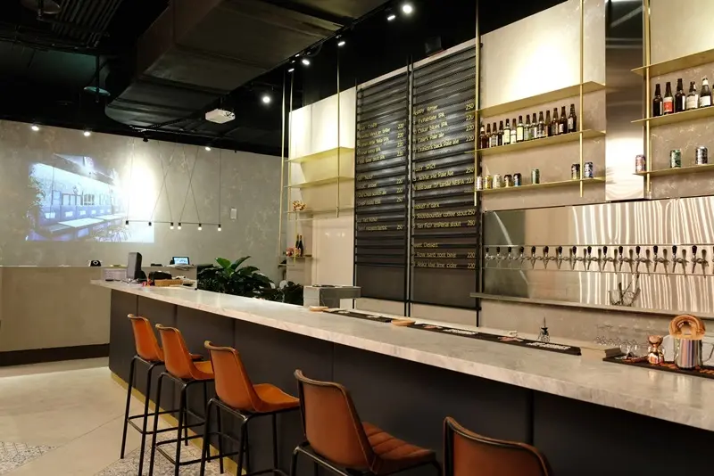▲時髦L型吧檯,供應各式精釀啤酒。